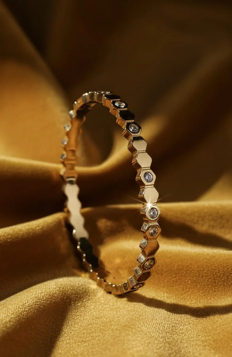 The Aira Bangle is a statement of bold elegance and modern luxury. Designed with a sleek gold-tone finish, this bracelet features a unique geometric link pattern accented with sparkling CZ stones that catch the light beautifully. Strong yet refined, Aurel is perfect for those who love premium jewelry with a confident, sophisticated edge. Ideal for everyday luxury or special occasions, this piece adds a powerful glow to any look. 💛