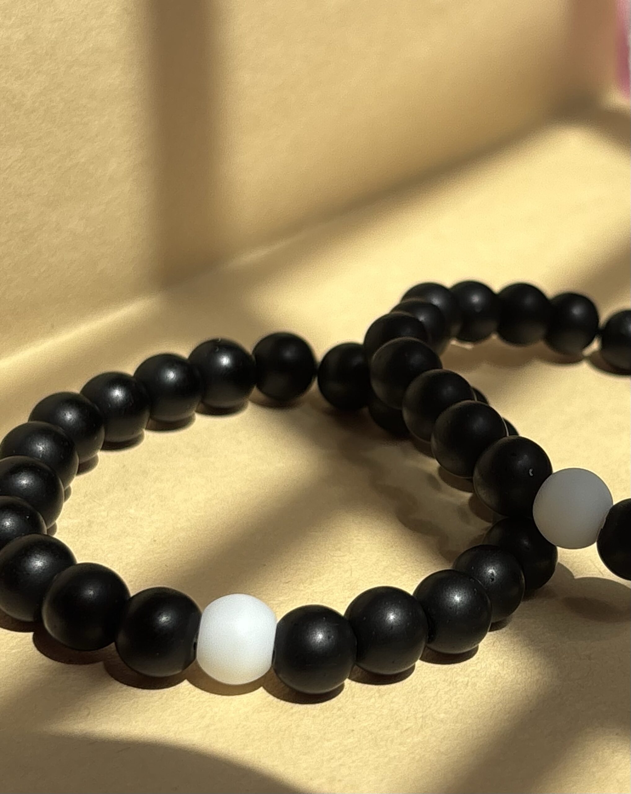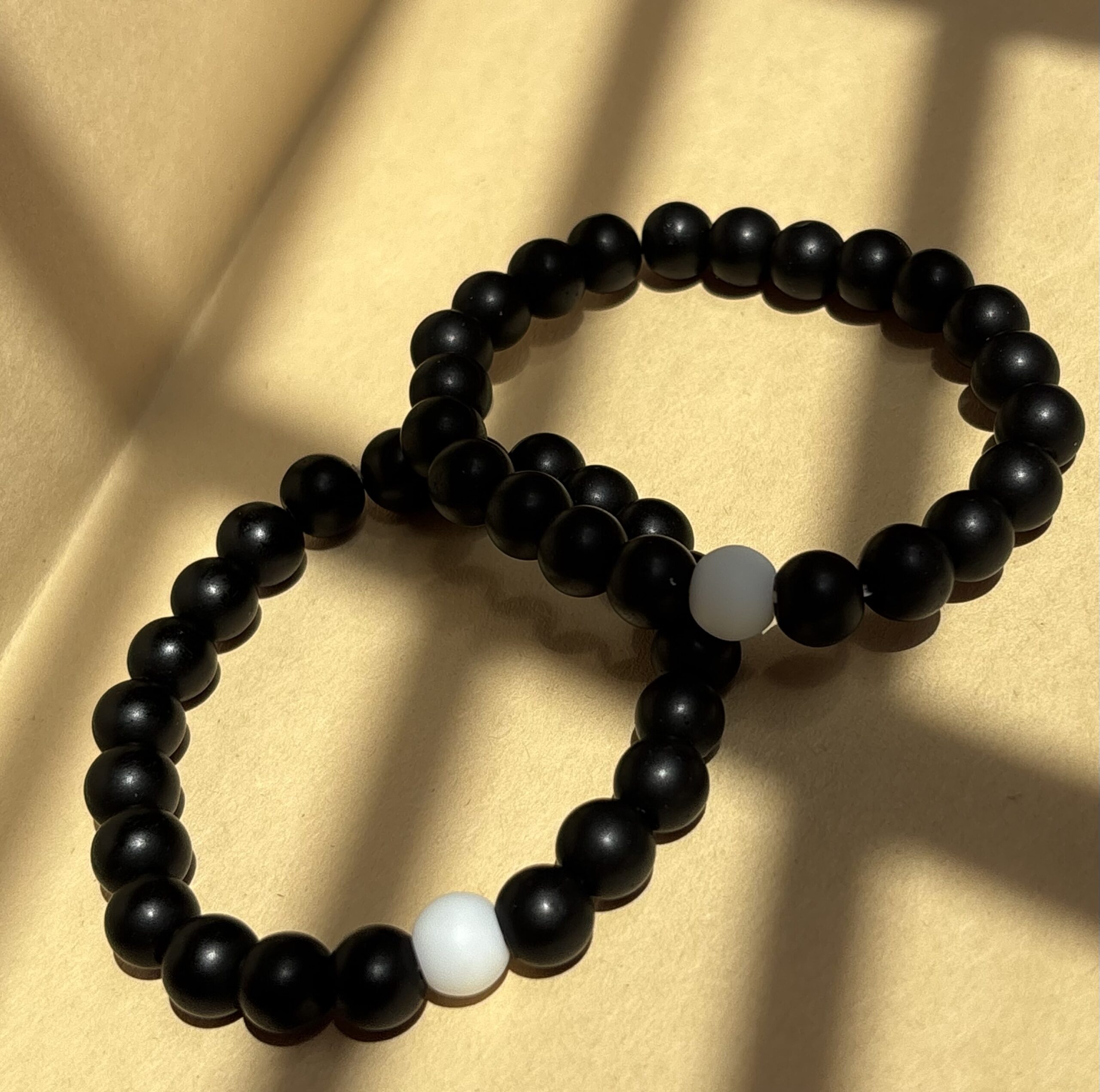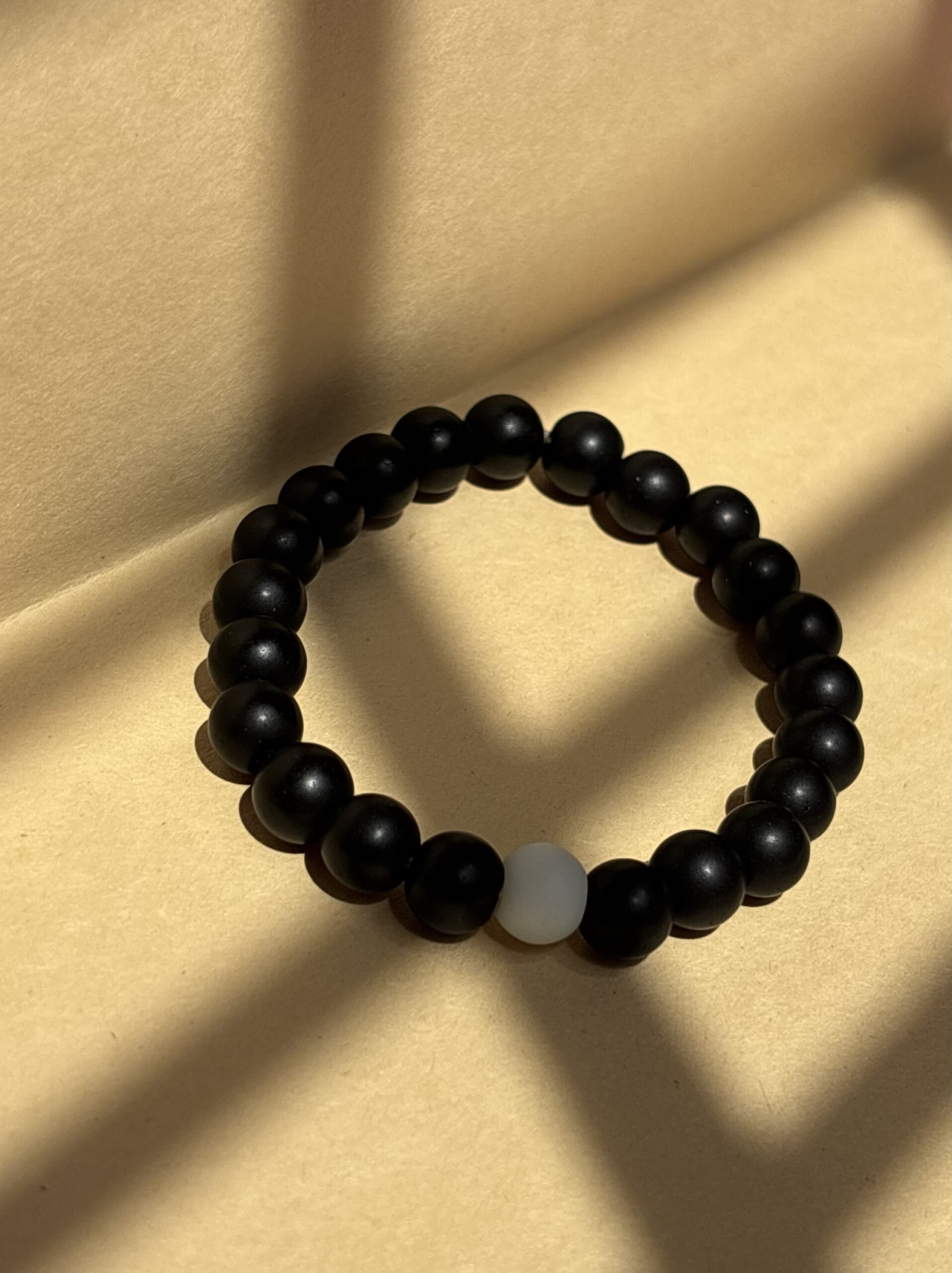 This black beaded bracelet features a single white centerpiece bead, representing balance, clarity, and calm amidst the chaos. A unisex favorite that speaks through contrast and quiet style.