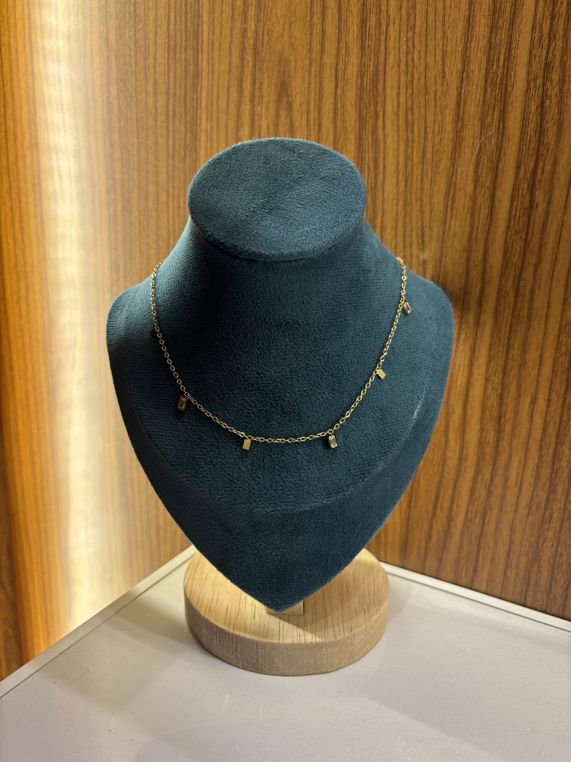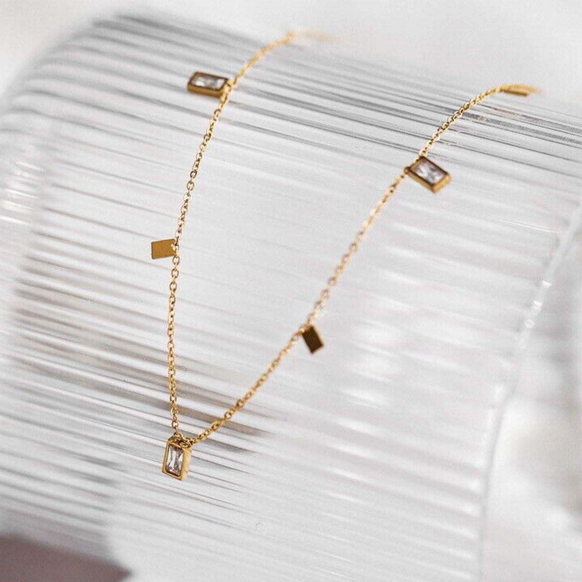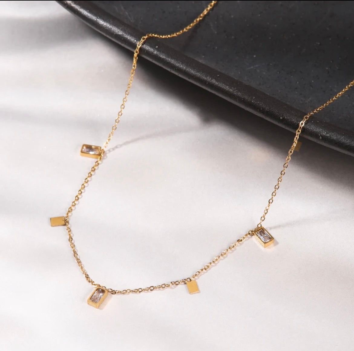 Graceful and timeless, the Elenora Necklace captures the beauty of simplicity with a touch of sparkle. Adorned with delicate rectangular charms and shimmering crystal accents, this piece adds effortless sophistication to any look — from everyday wear to evening elegance.