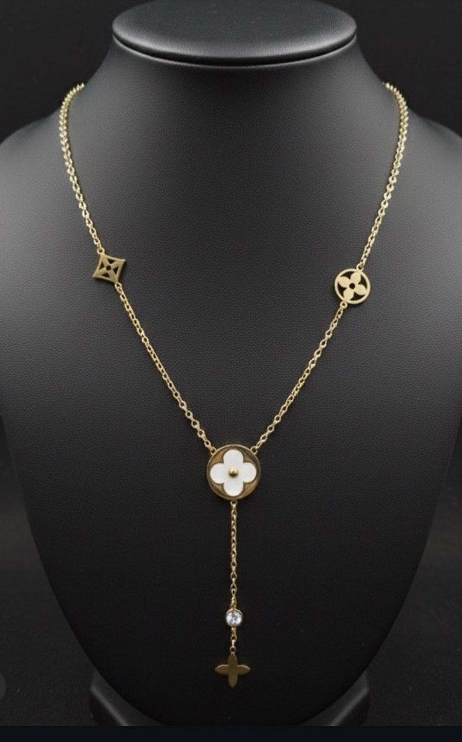 Featuring a delicate white floral charm at the center with mini symbolic motifs along the chain, this lariat-style design falls beautifully and enhances any neckline effortlessly.