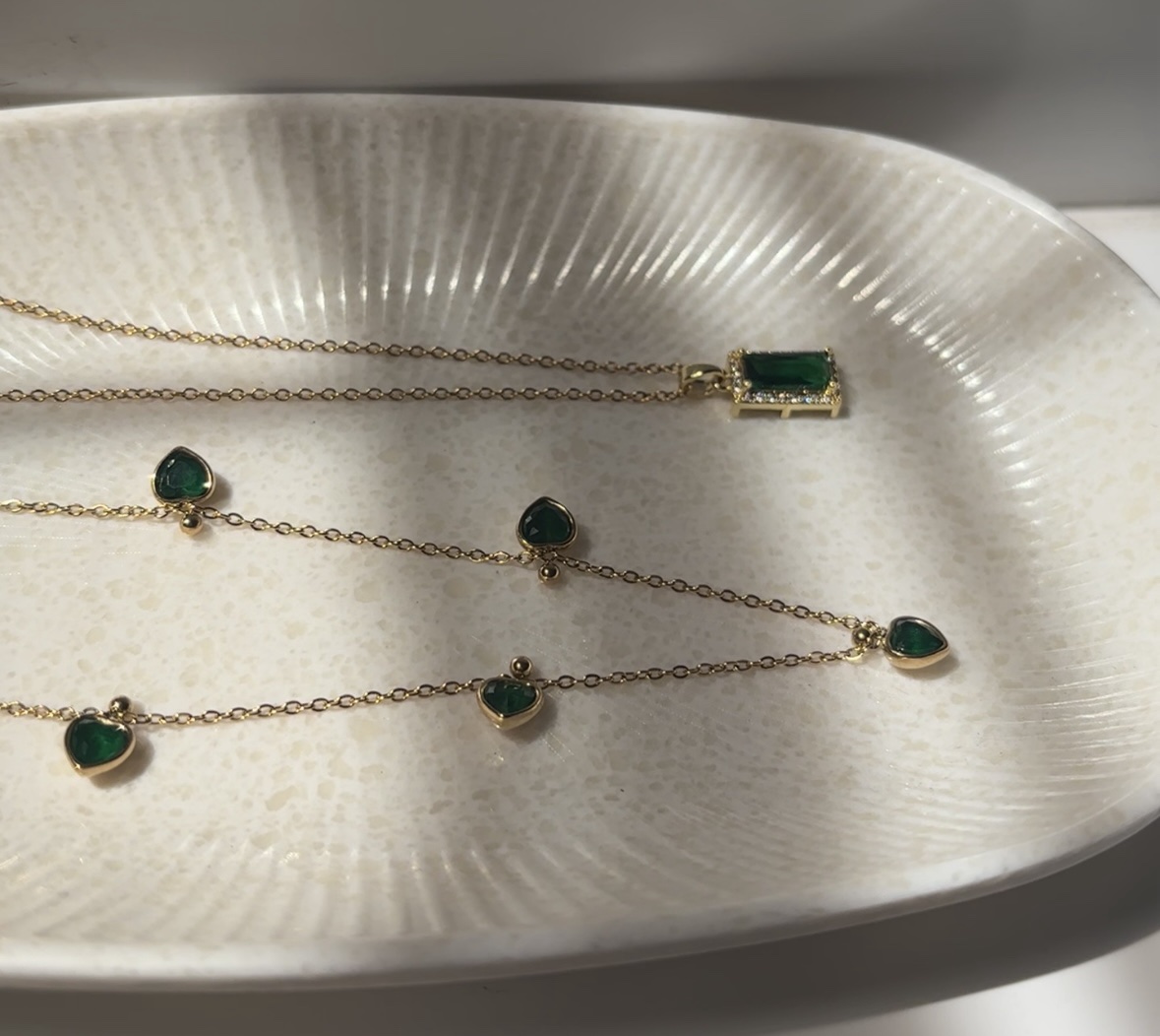 Add a touch of elegance with this delicate layered chain necklace, adorned with alternating emerald-green and crystal-clear heart charms. Each charm is set in a sleek gold finish, giving a refined yet minimal look perfect for everyday wear or special occasions.